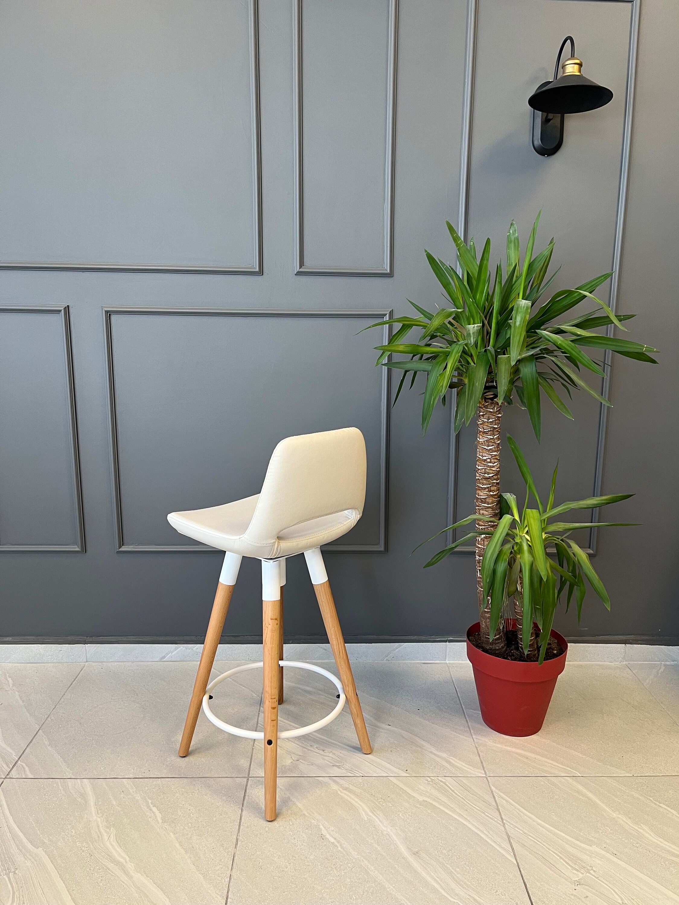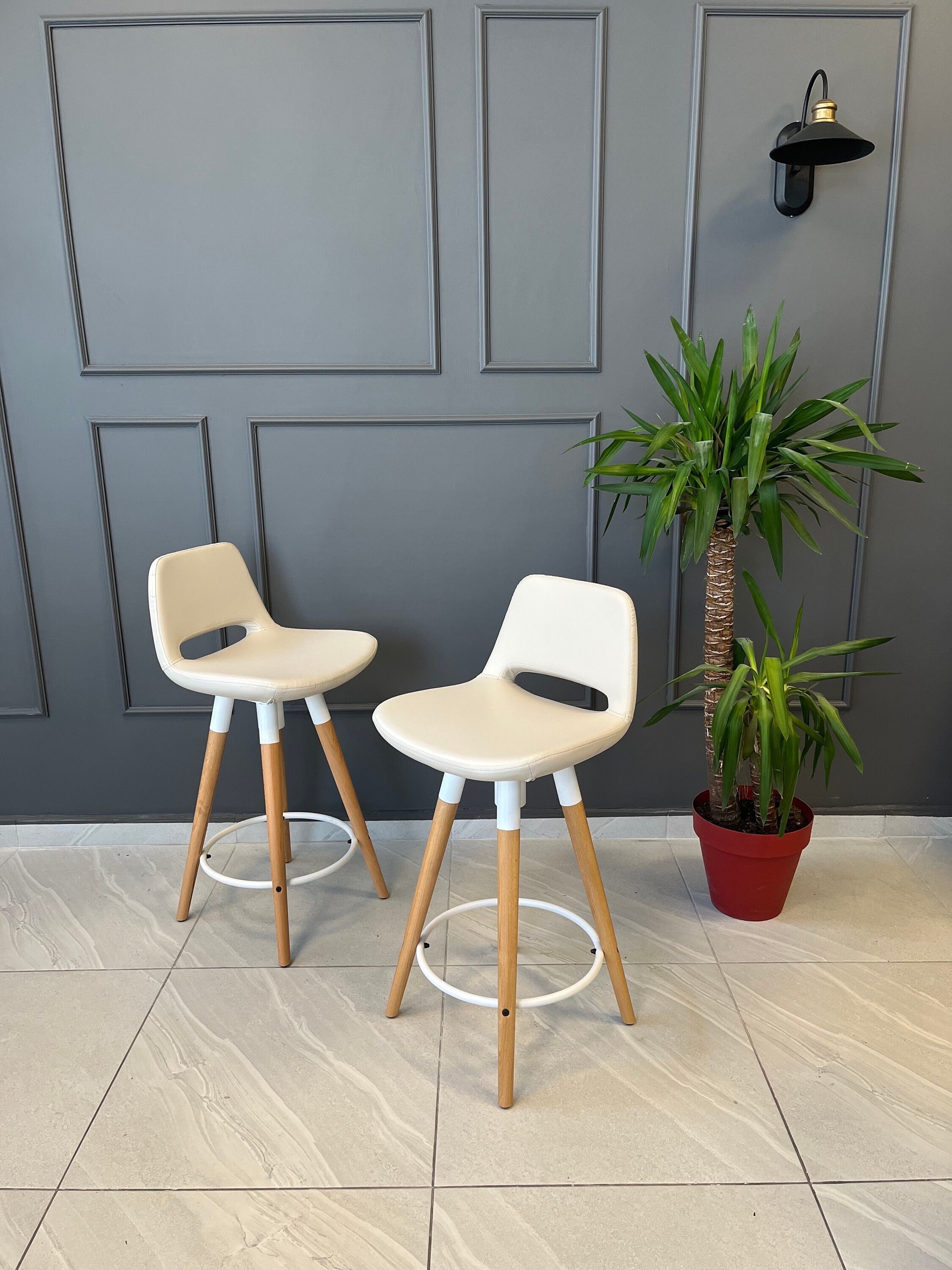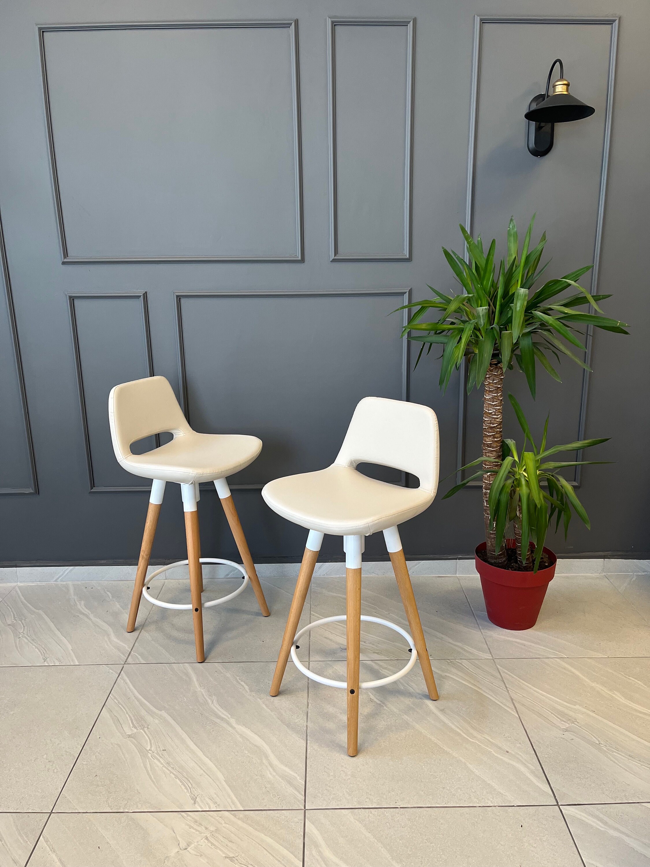 I ordered a stool with black leather. All chairs in the Etsy store with black seats had black metal trim on base. The leather chair pictured had a white seat with white trim. I got a black chair with white trim that looked bad. When I asked why I had white trim on a black chair. I was told the picture showed white trim… .. But the chair cushion was white.? so it matched…of course it should have white trim. There was no where I saw I was suppose to indicate what color metal trim I wanted. I had to take it apart and paint black for it to look ok. Also the ring on the base of the stool is the wrong size to rest your feet, it needs to be bigger to rest your feet off the floor at a comfortable angle. So basically I was not happy with my purchase.