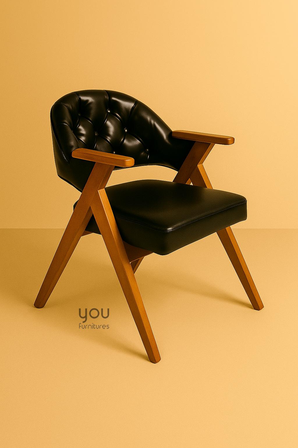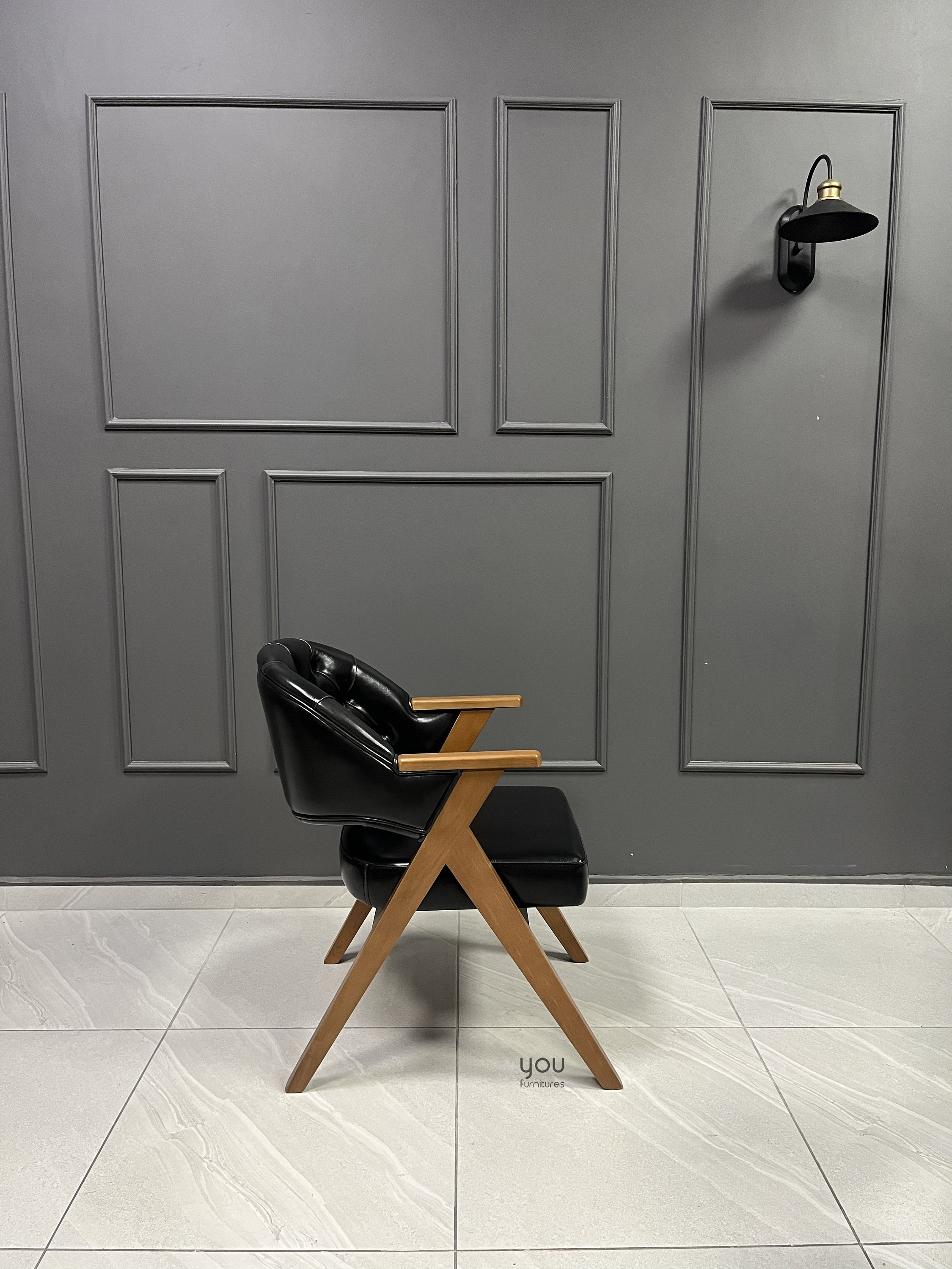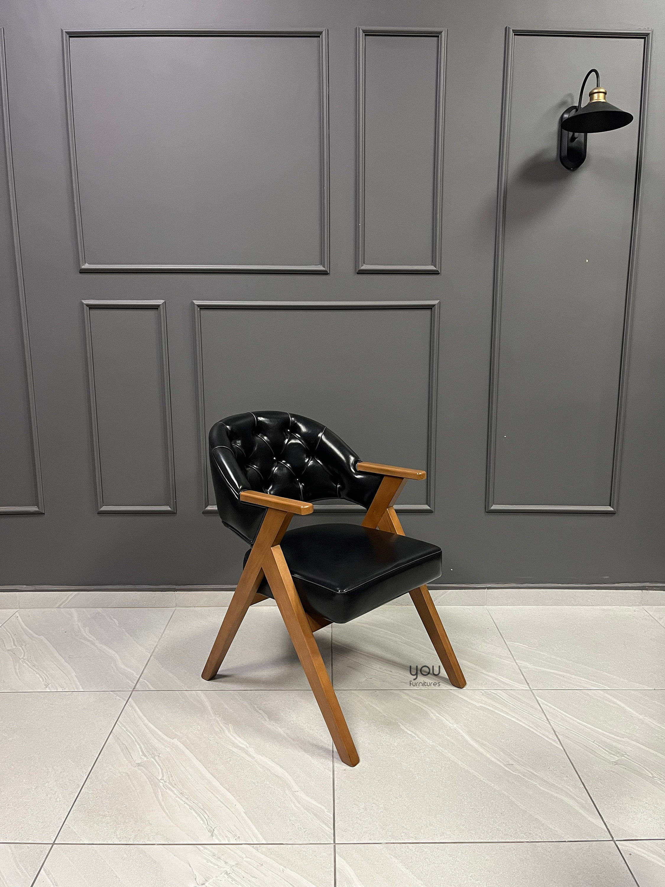 Upholstery material is vegan leather, it is possible to upgrade it to genuine leather.