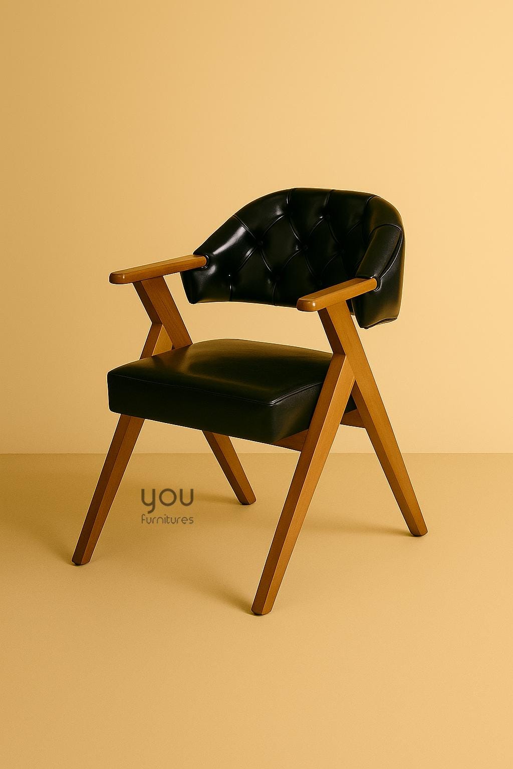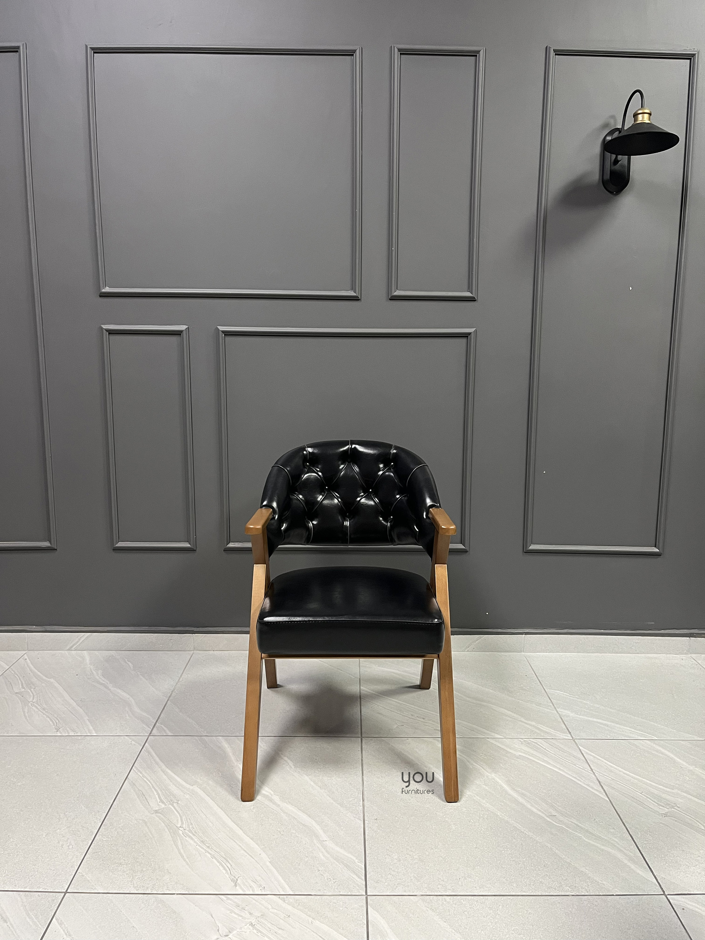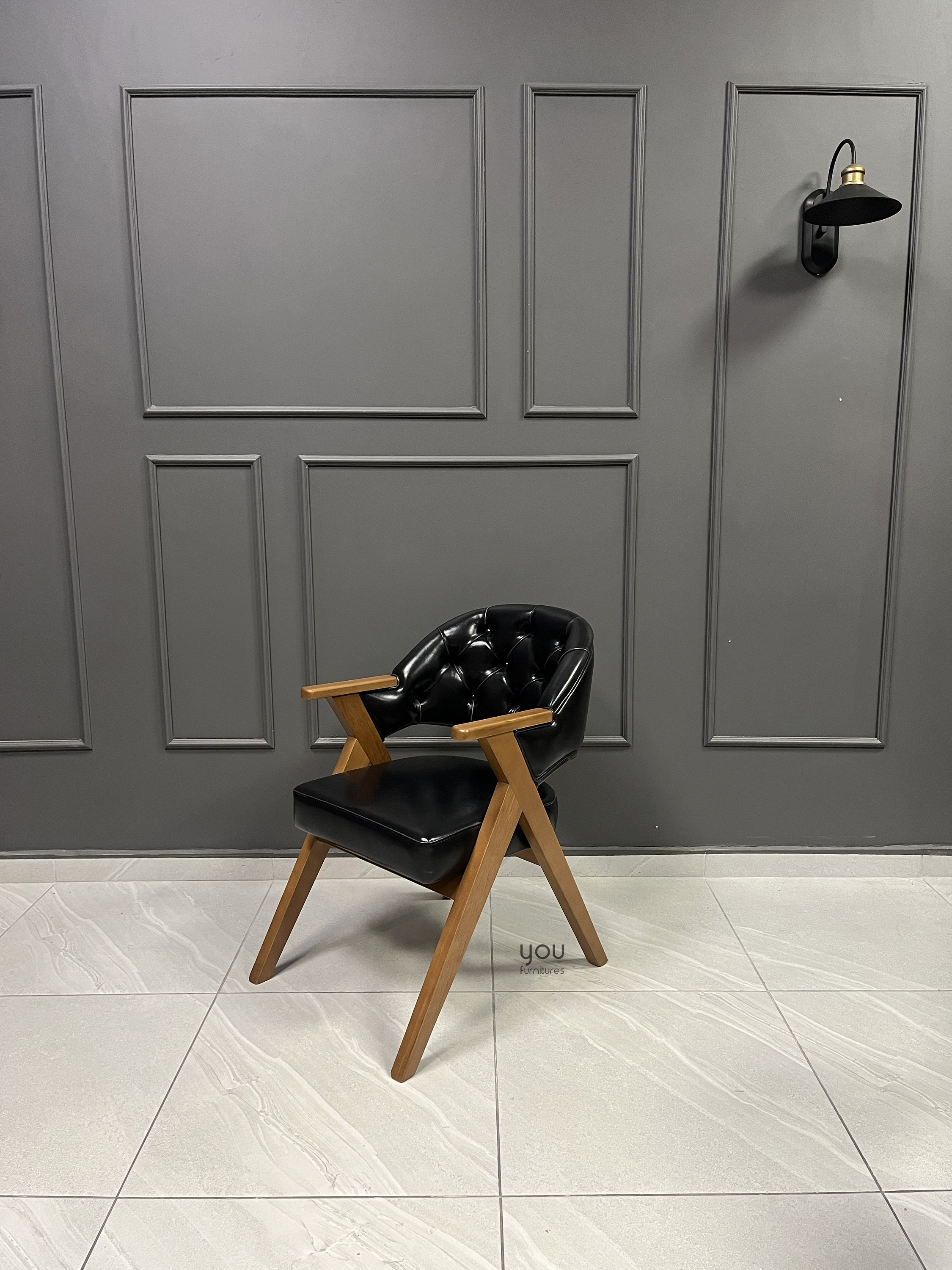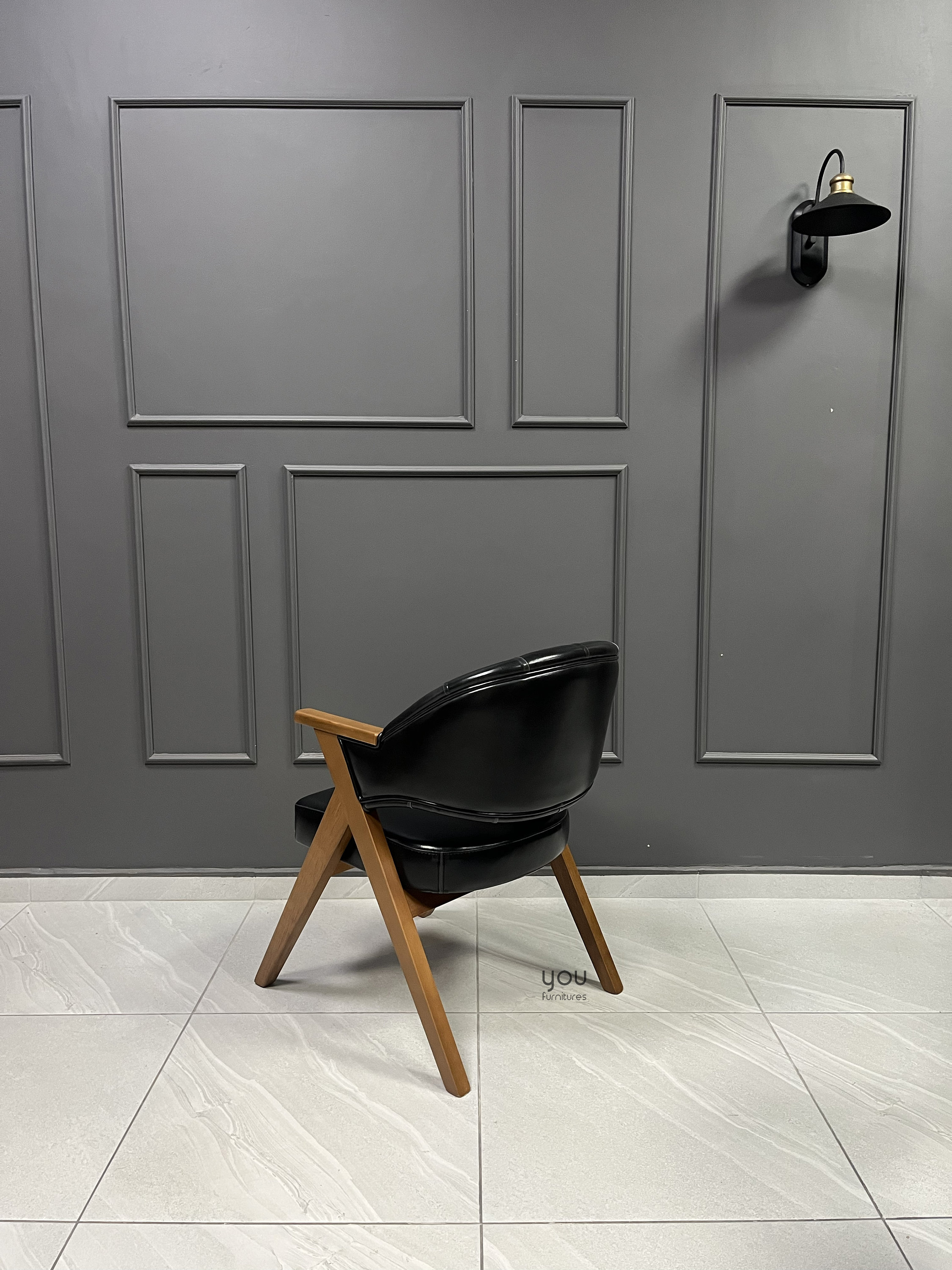 Upholstery material is vegan leather, it is possible to upgrade it to genuine leather.