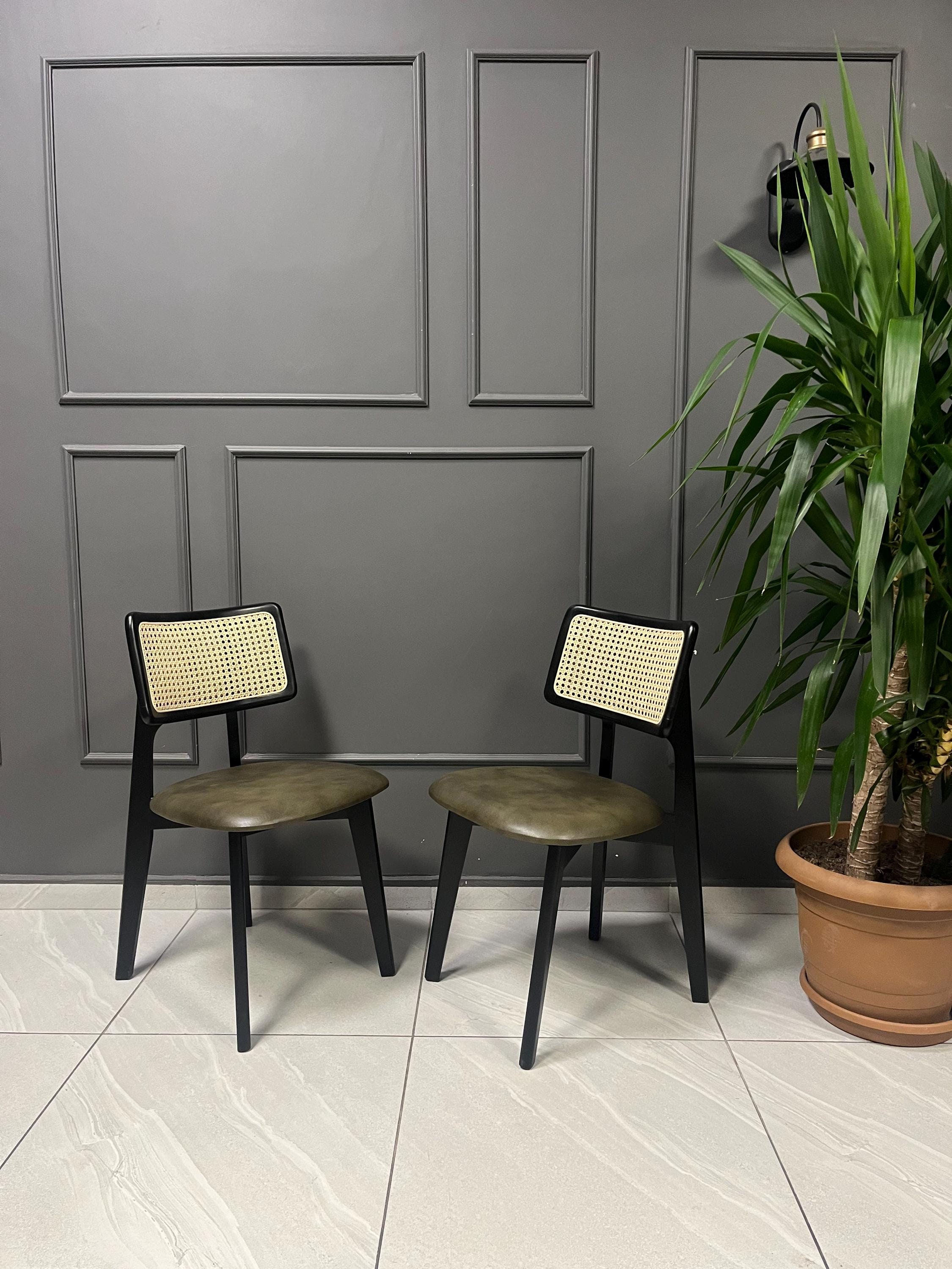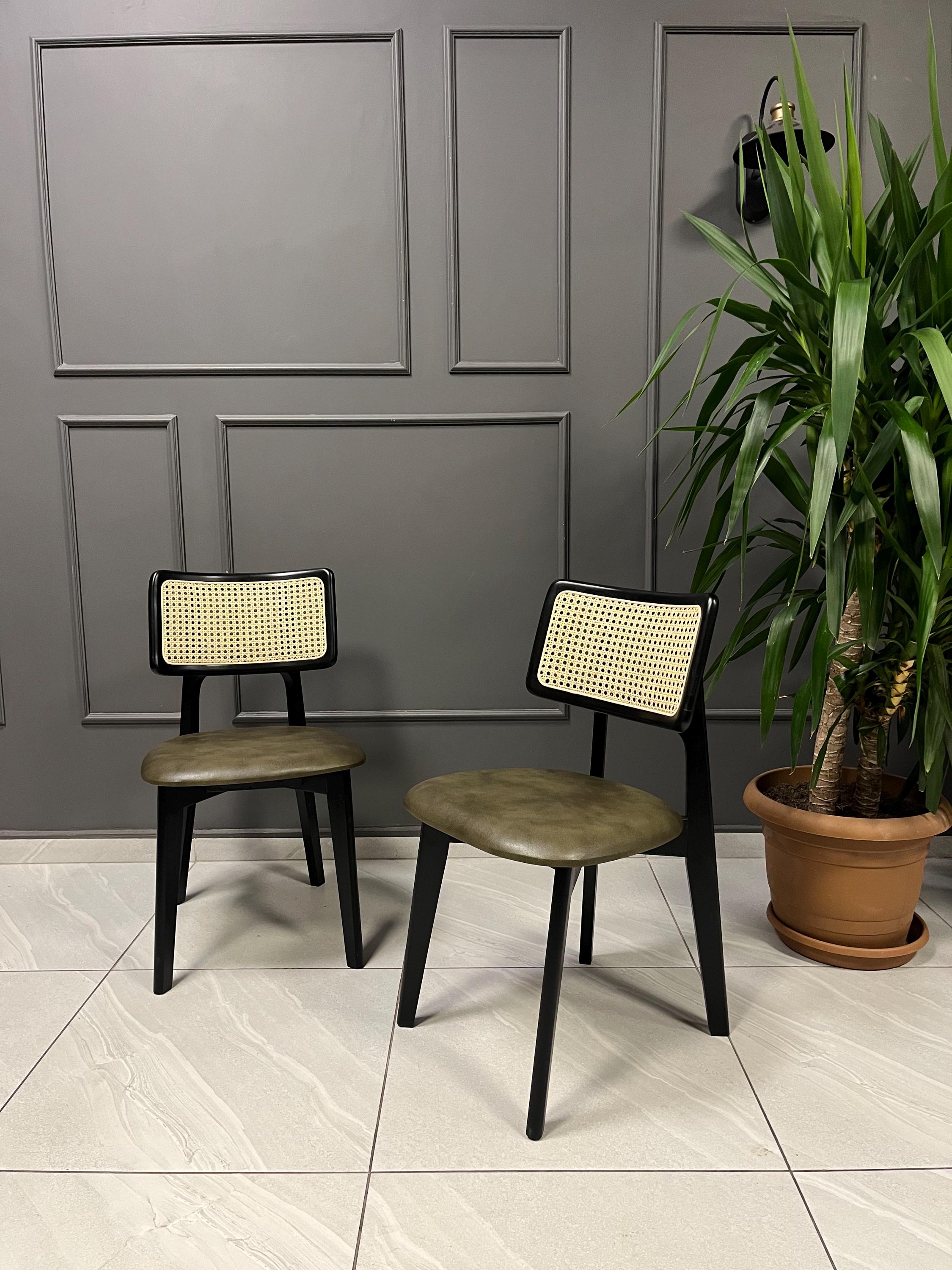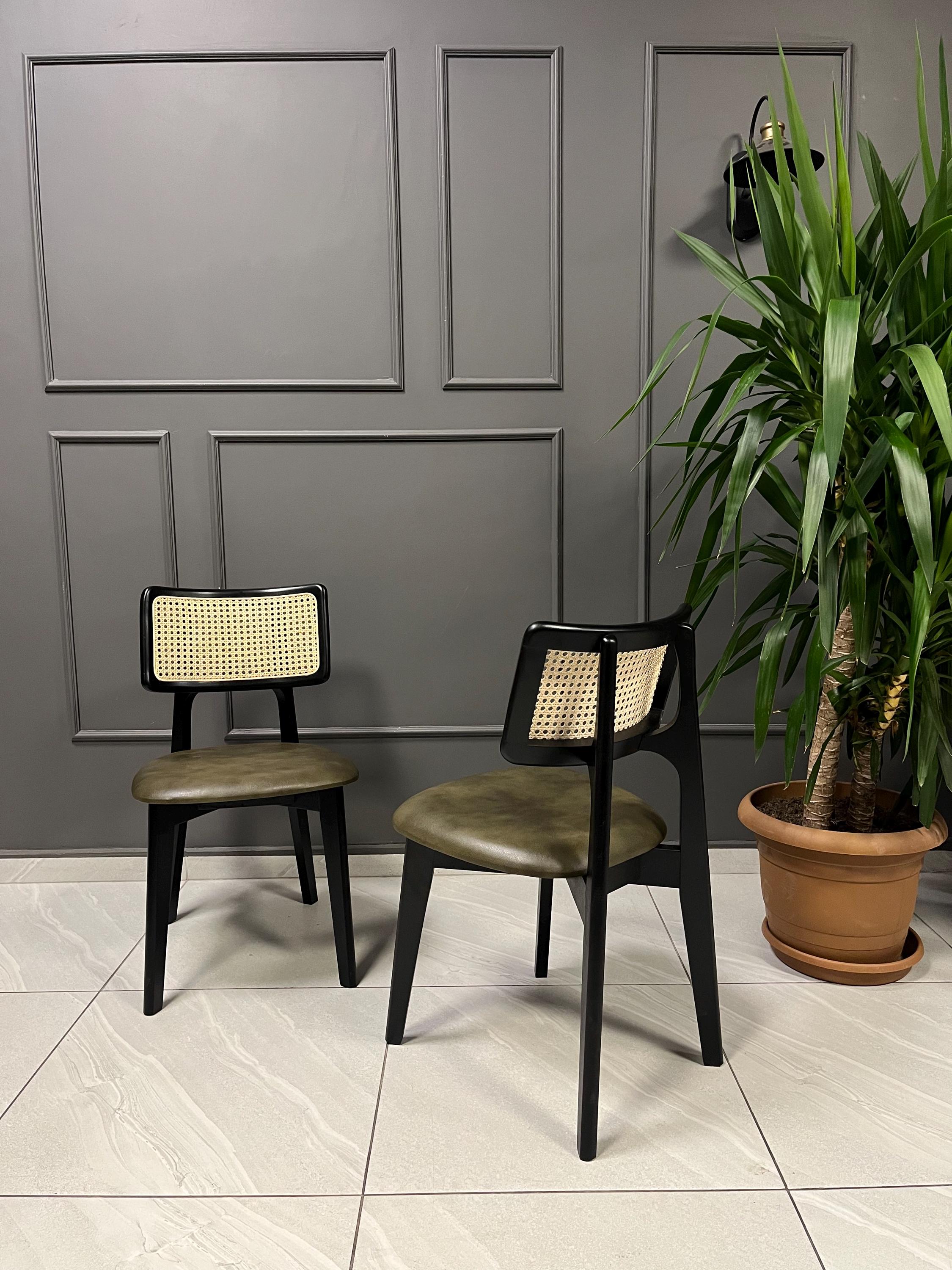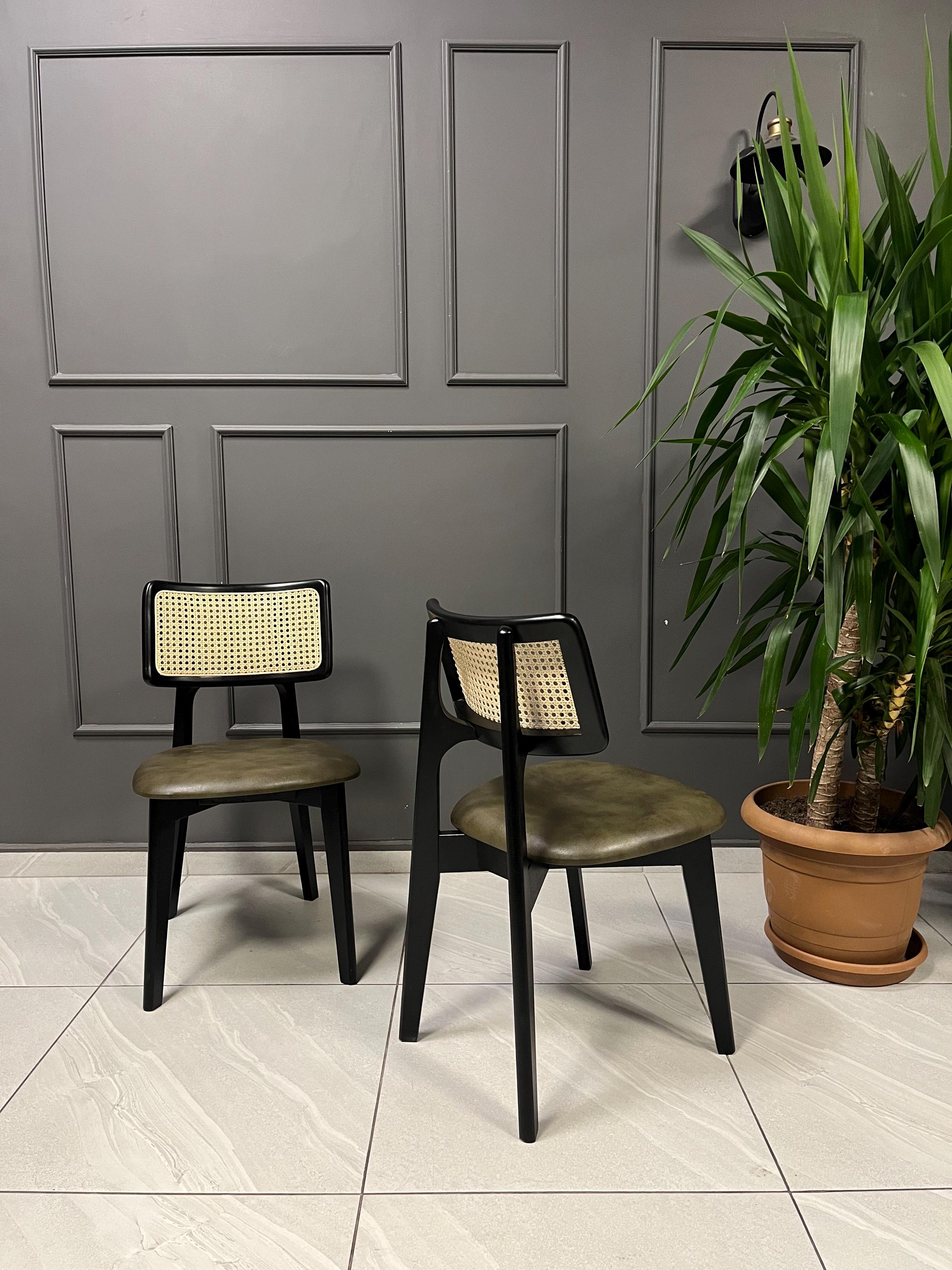 Chairs on the listing photos have ''Black stained frame, 100% original handmade rattan, YF-122 distressed green vegan leather''.