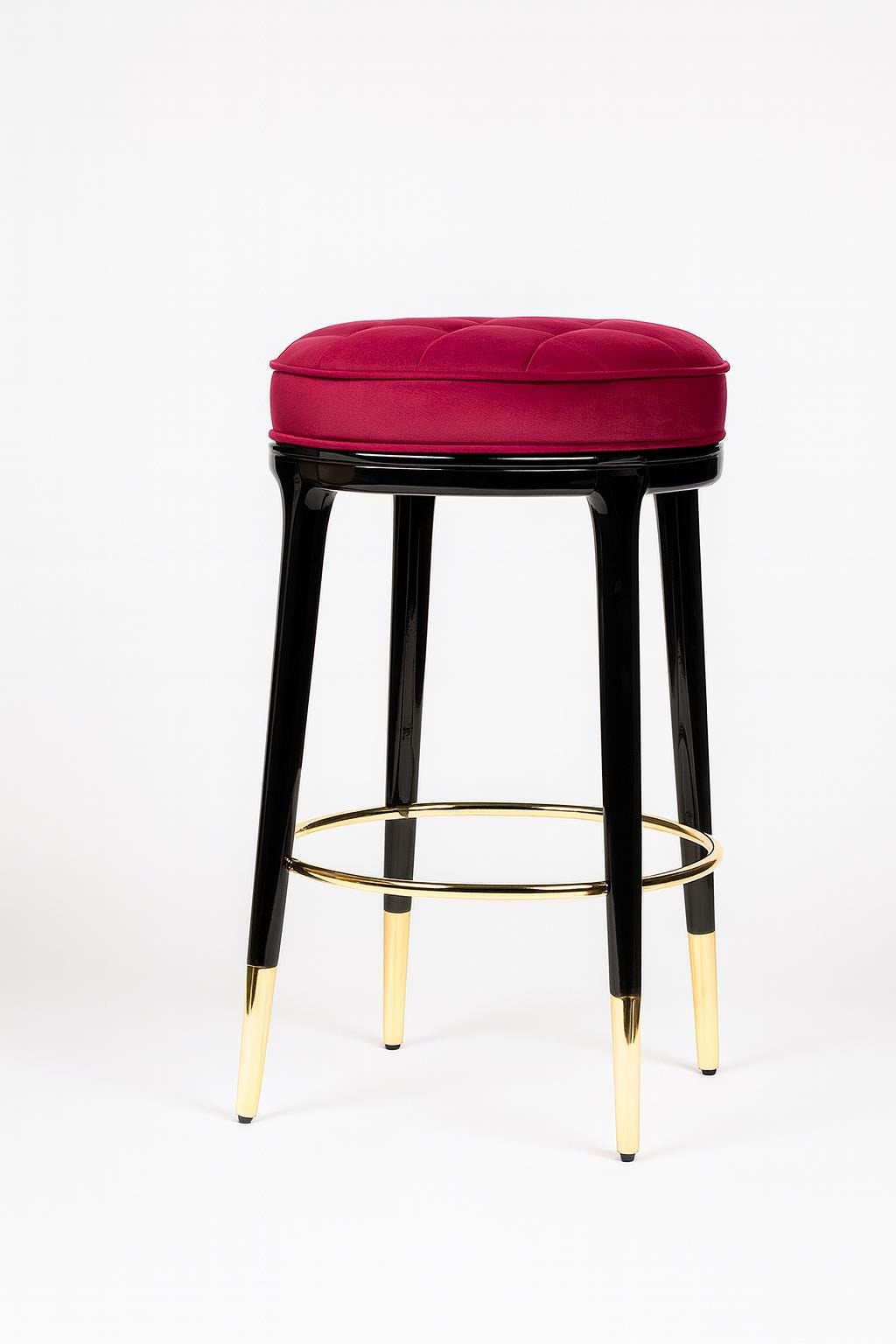 Elevate your interior with the Alberto Bar Stool, a perfect balance of modern glamour and timeless craftsmanship. Featuring a plush tufted velvet seat in rich burgundy, sleek black legs, and elegant gold accents, this stool brings a sophisticated touch to any home bar, kitchen island, or café space.