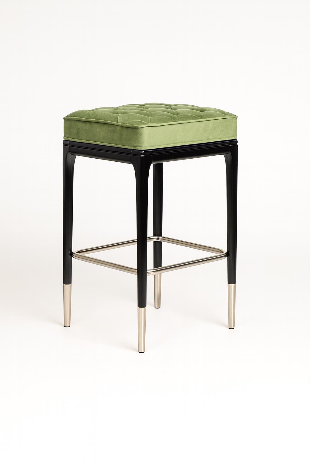 Add a touch of luxury to your kitchen or bar area with the Alora Bar Stool, where elegance meets comfort. This handcrafted stool features a tufted velvet cushion in soft green tones, a solid wood frame in deep black, and brushed metal accents for a refined modern look.