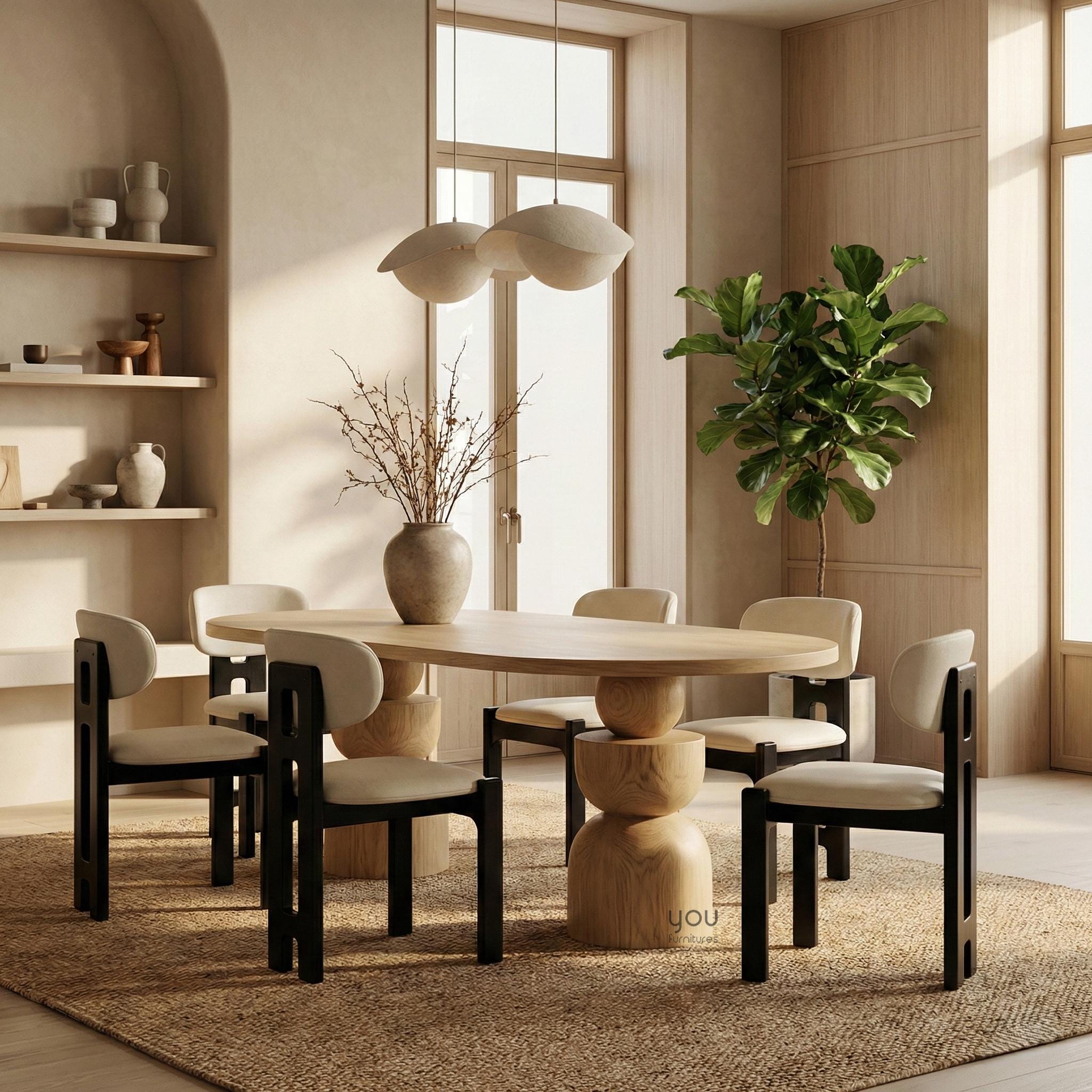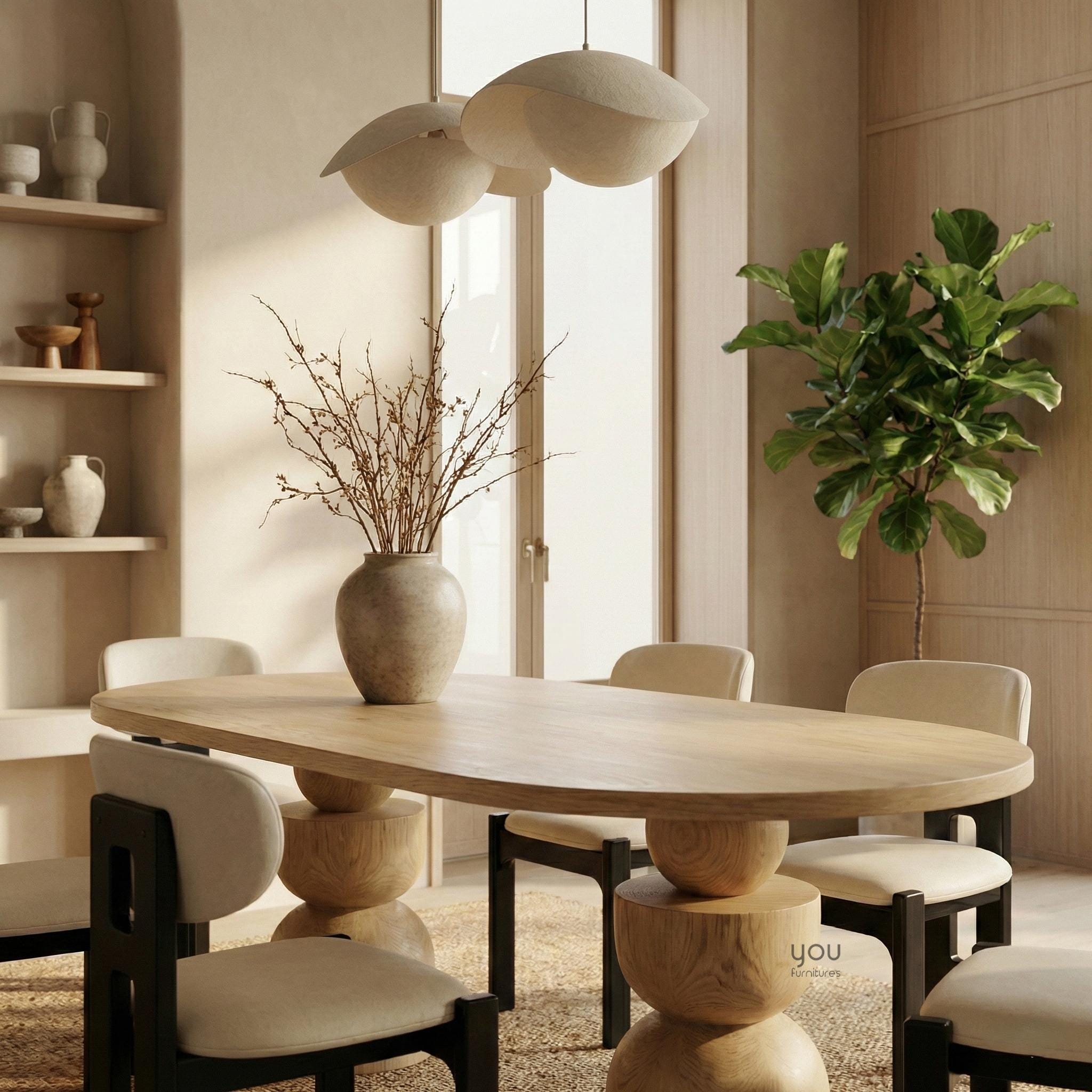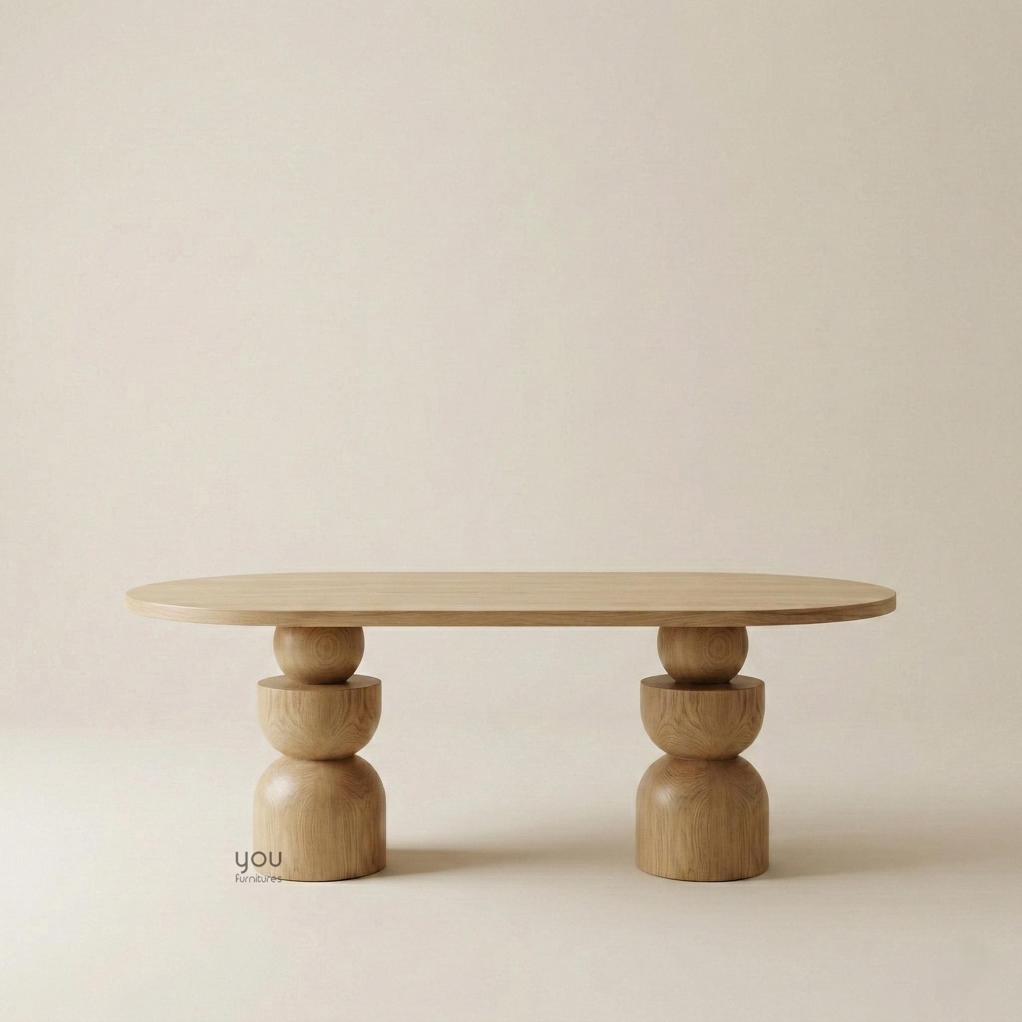 This sculptural oval dining table by You Furnitures blends contemporary design with timeless craftsmanship. The distinctive double pedestal base composed of stacked organic forms creates a striking silhouette that feels both modern and artistic.
